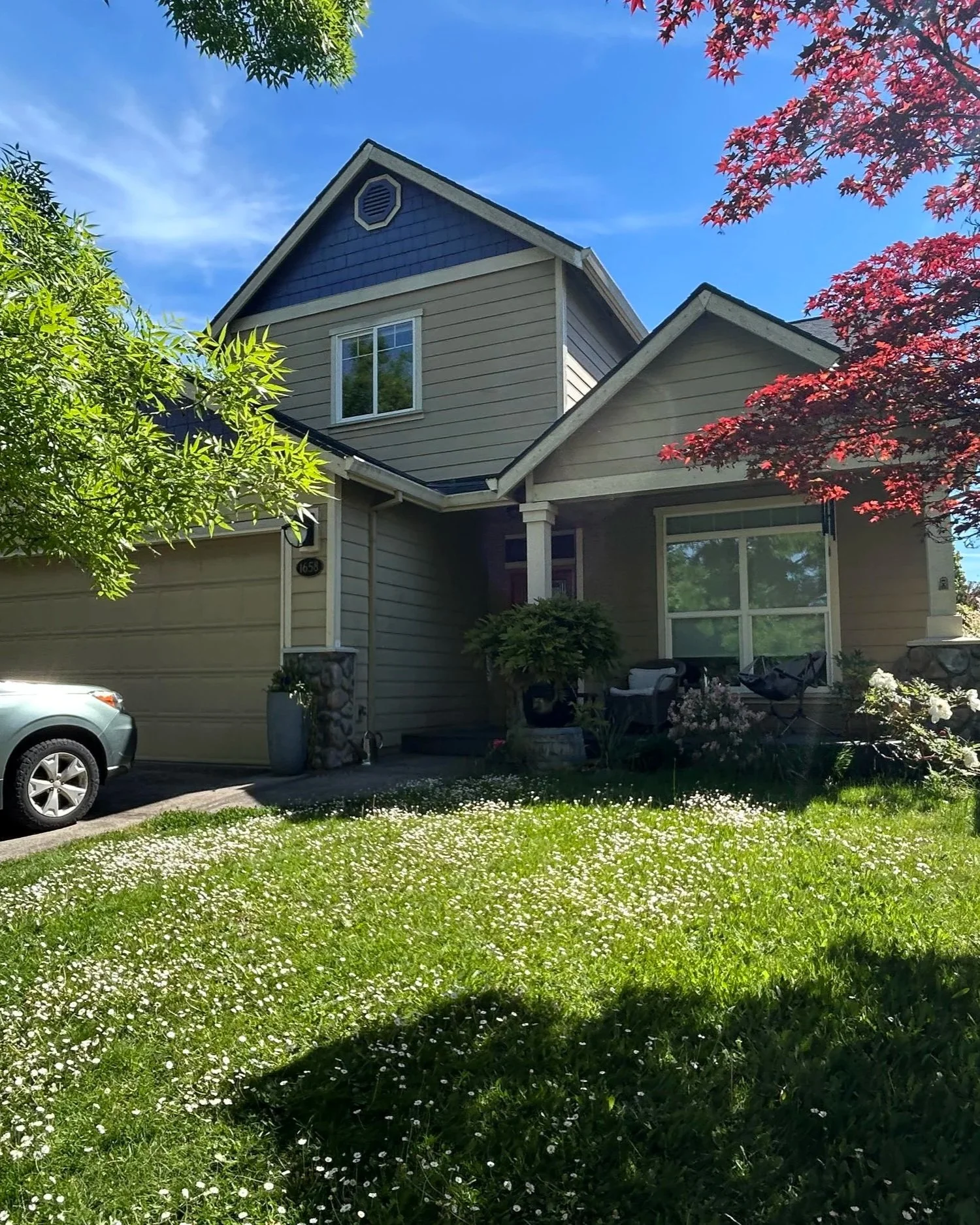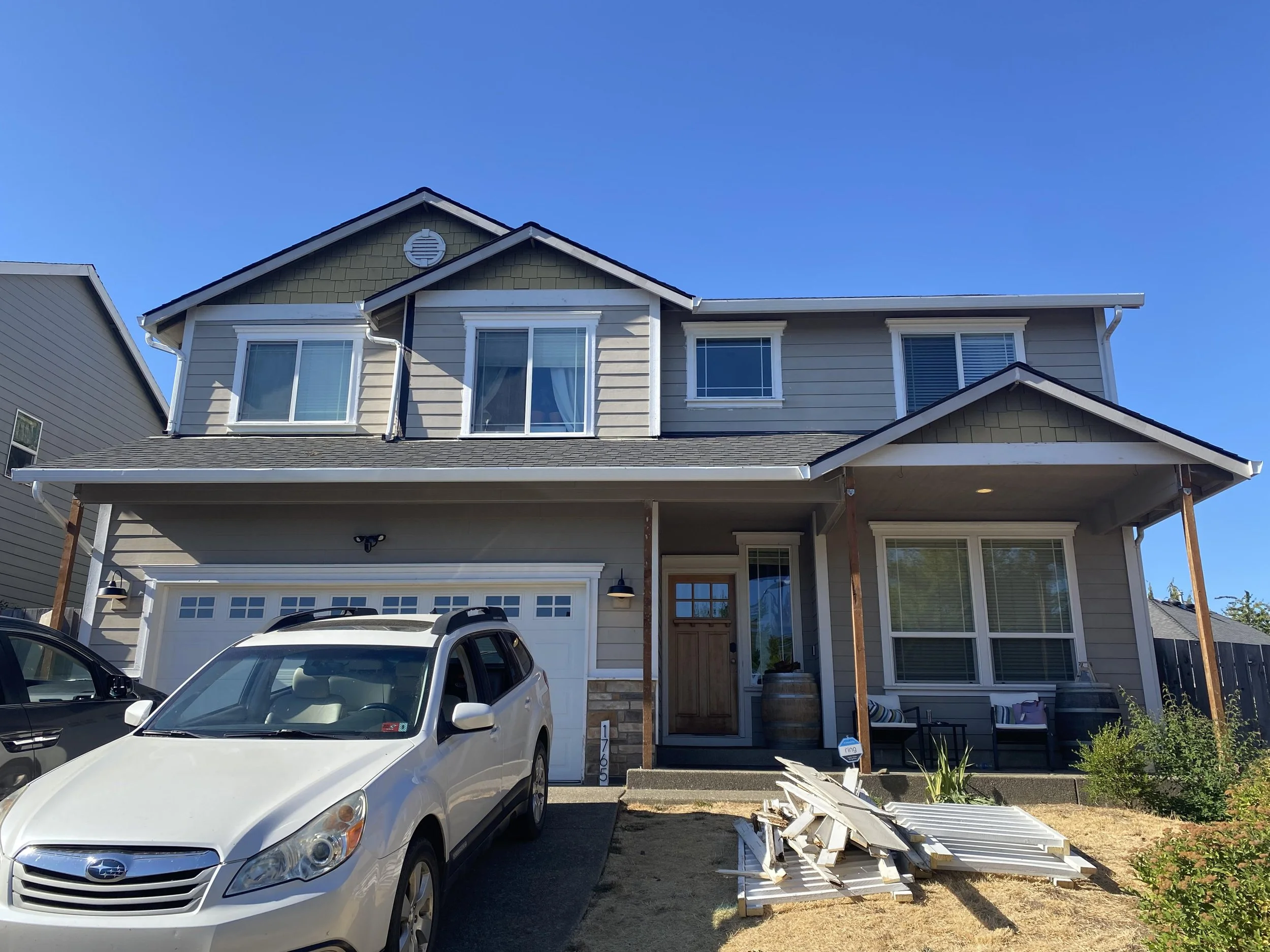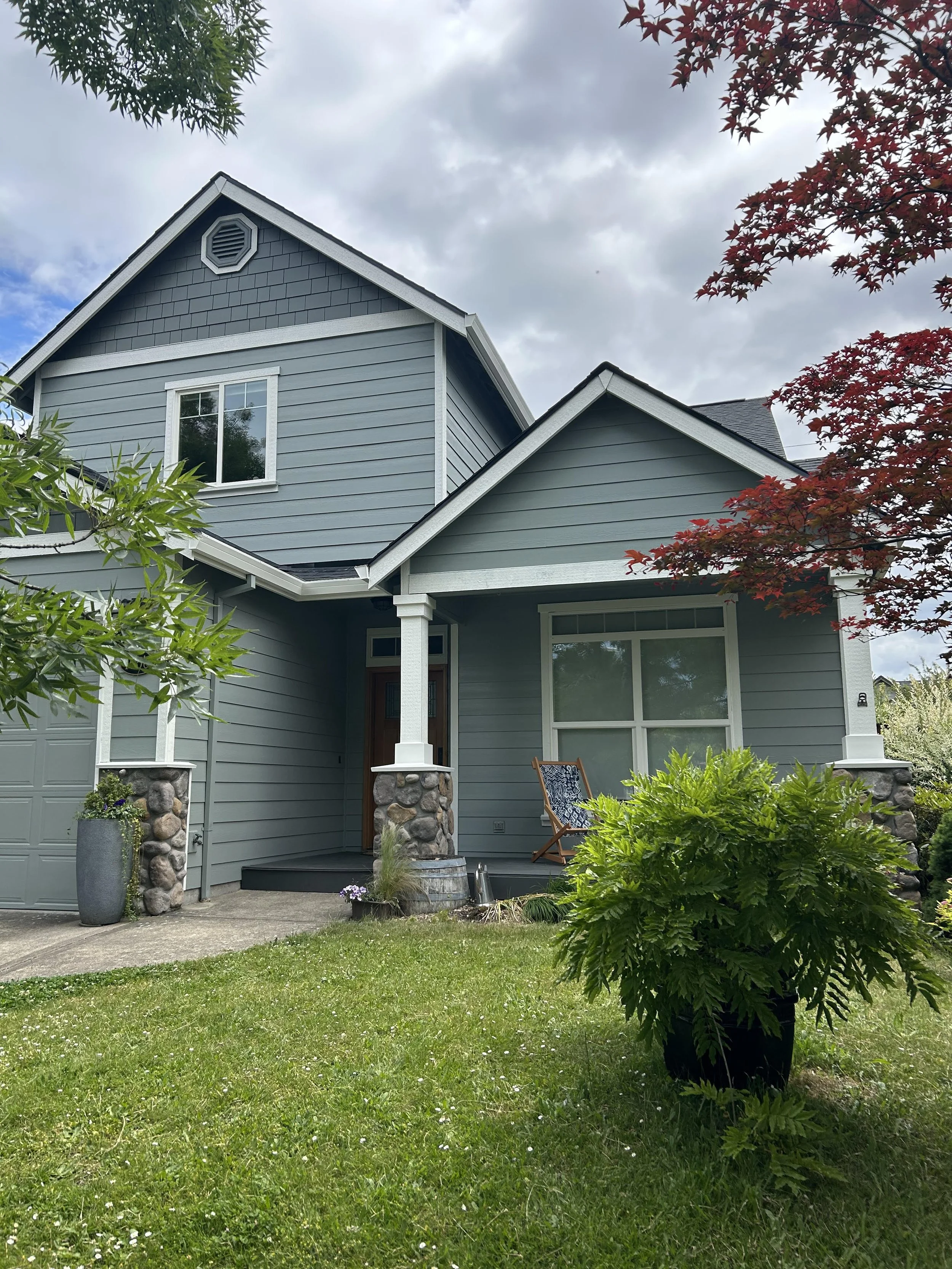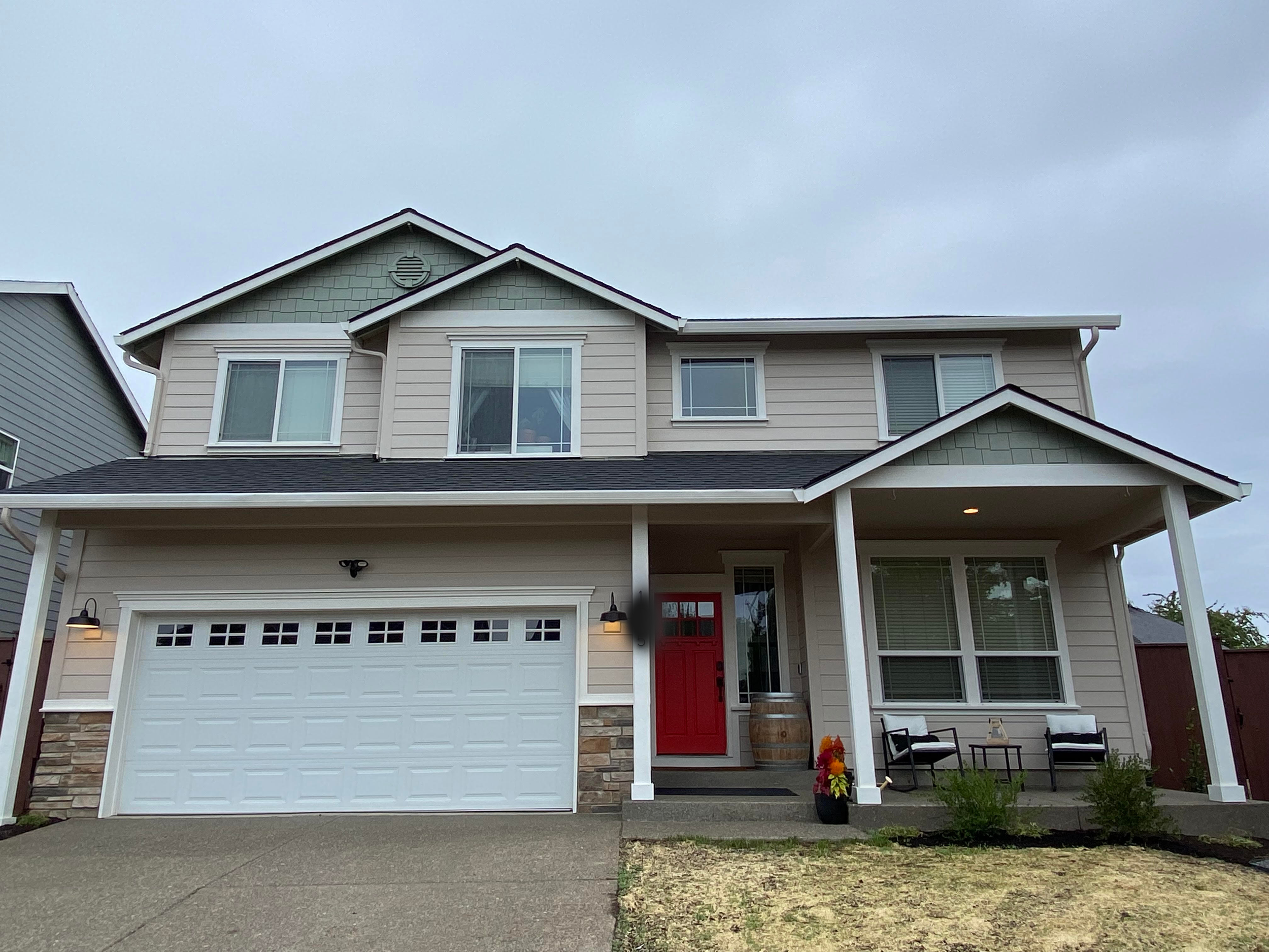 AFTER: A new beige with pink undertones chosen to harmonize with Oregon’s changing, seasonal skies pairs with a happy and on-trend sage green. A pop of color on the door, along with the home’s new hardware and a porch fence removal, creates a place the whole family can feel great returning to. [House number removed for privacy]